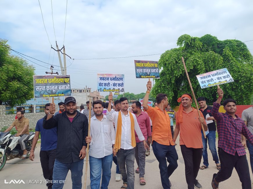 दौसा में अवैध धर्मांतरण पर हिंदू संगठनों का विरोध. प्रदर्शनकारियों ने बुलडोजर पर सवार होकर रैली भी निकाली
