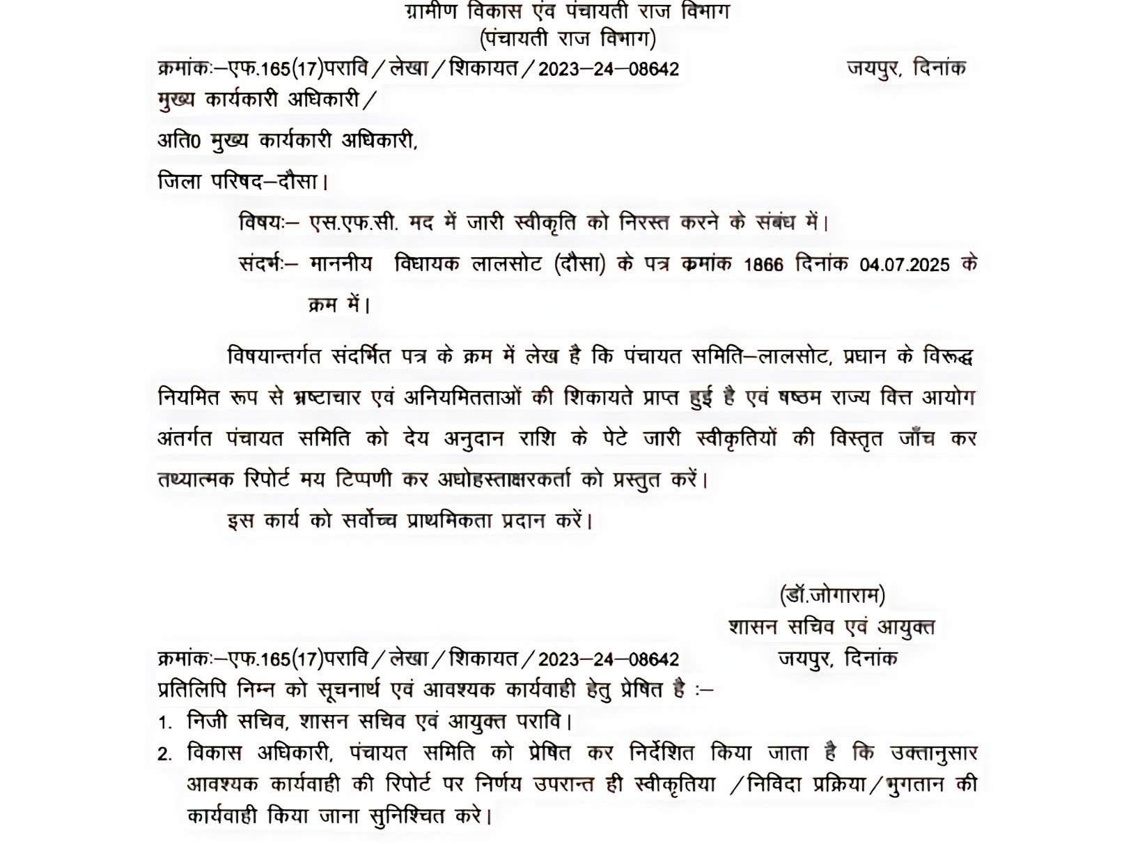शासन सचिव ने 4 जुलाई को विधायक रामबिलास मीणा द्वारा भेजे गए पत्र और प्रधान के विरुद्ध लगातार मिल रही भ्रष्टाचार व अनियमितताओं की शिकायतों के आधार पर निर्देश जारी किए हैं। उन्होंने कहा कि षष्ठम राज्य वित्त आयोग (SFC) के तहत पंचायत समिति को प्राप्त अनुदान की स्वीकृतियों की विस्तृत जांच कर तथ्यात्मक रिपोर्ट प्रस्तुत की जाए।