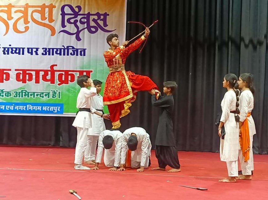 सांस्कृतिक कार्यक्रम में विभिन्न विद्यालयों के छात्र-छात्राओं के द्वारा देशभक्ति एवं राष्ट्रीय एकता गीतों की प्रस्तुति दी जिनमें मॉन्टेसरी स्कूल की छात्राओं ने सरस्वती वंदना, गुरू हरिकिशन द्वारा पृथ्वीराज चौहान गीत, अग्रसेन विद्यापीठ द्वारा सरहद चले सरहद पर हम, एसबीके द्वारा मैं भारत की बेटी हूँ, टीएम द्वारा कोरस, डीपीएस द्वारा तलवारों पर सर वार दिए, सोनी एकेडमी द्वारा झण्डा गीत, सेन्ट पीटर्स द्वारा पहलगांव एवं ऑपरेशन सिन्दूर आधारित सामूहिक प्रस्तुति ने दर्शकों को तालियां बजाने को मजबूर कर दिया। फाईनमैन द्वारा मेरे देश की धरती, सनातन धर्म द्वारा नारी की शक्ति, होली मदर द्वारा हम भारत को गायेंगे, सुरजीत द्वारा राजस्थानी, बीएम द्वारा सुभाषचन्द बोस, अन्तरिक्ष द्वारा काली एक्ट, एपीएस द्वारा स्वच्छ शौच एवं संत कृपाल द्वारा देशभक्ति गीत पर मनमोहक नृत्य की प्रस्तुति दी। कार्यक्रम में सीडीओ अनित कुमार, डीईओ सुरेन्द्र गोपालिया सहित अन्य जिला स्तरीय अधिकारी एवं गणमान्य नागरिक मौजूद रहे।