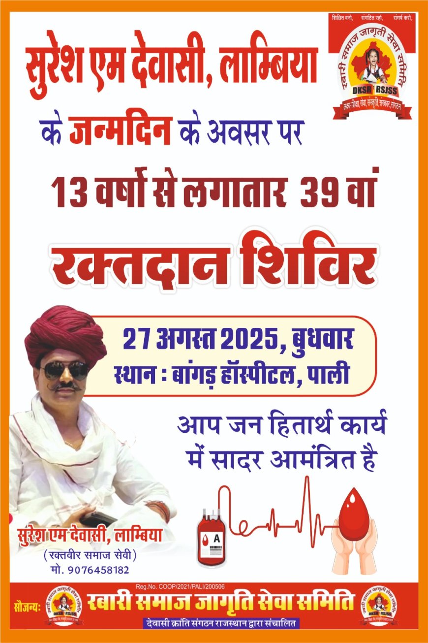 जिला पाली बांगड़ हॉस्पिटल पाली बुधवार को रक्तवीर और समाजसेवी सुरेश एम देवासी लांबिया के जन्मदिवस (27 अगस्त)के उपलक्ष में है विशाल रक्तदान शिविर का पाली बांगड़ अस्पताल में आयोजन किया जा रहा है। जिसमें रबारी समाज जागृति सेवा समिति एवम टीम सुरेश एम देवासी लांबिया के नेतृत्व में युवाओं द्वारा रक्तदान किया जाएगा।