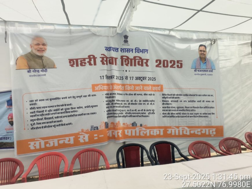 शहरी सेवा शिविर आमजन को लाभ प्रदान करने के उद्देश्य से राजस्थान सरकार के द्वारा लगाए जा रहे हैं मुख्यमंत्री भजनलाल शर्मा की है। यह योजना नगर पालिका क्षेत्र गोविंदगढ़ में पिछड़ती हुई नजर आ रही है। कार्य नहीं होने से आमजन का भी इन शिविरों से मुंह भंग होता हुआ नजर आ रहा है जिसके कारण शिविर के पांडाल खाली नजर आ रहे हैं।