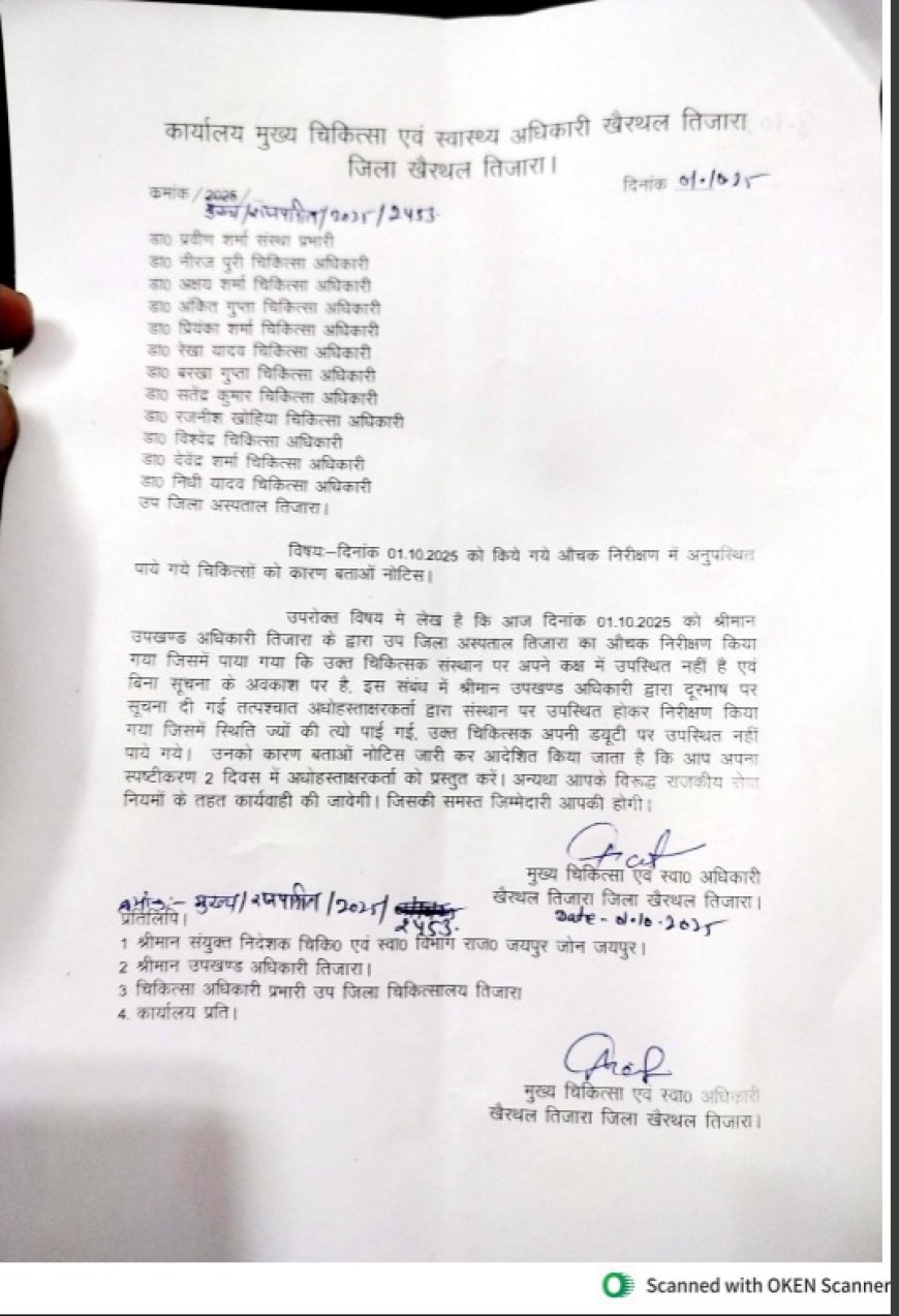 इधर, खैरथल-तिजारा जिला कलेक्टर किशोर कुमार के निर्देशन में उप जिला अस्पताल तिजारा में उपखण्ड अधिकारी तिजारा द्वारा किए गए औचक निरीक्षण में बड़ी लापरवाही सामने आई। निरीक्षण के दौरान कुल 11 चिकित्सक अपने कक्षों में अनुपस्थित पाए गए। इनमें संस्था प्रभारी डॉ. प्रवीण शर्मा सहित डॉ. नीरज पुरी, डॉ. अक्षय शर्मा, डॉ. अंकित गुप्ता, डॉ. प्रियंका शर्मा, डॉ. रेखा यादव, डॉ. बरखा गुप्ता, डॉ. सतेंद्र कुमार, डॉ. रजनीश खोहिया, डॉ. विश्वेद, डॉ. देवेंद्र शर्मा एवं डॉ. निधि यादव शामिल है। निरीक्षण के दौरान सभी चिकित्सक बिना पूर्व सूचना के अनुपस्थित पाए गए।