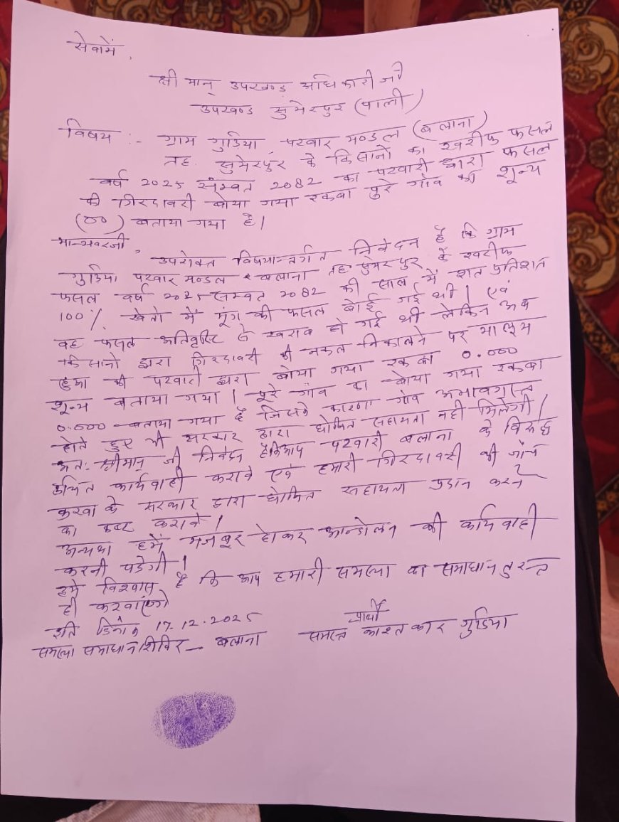 शिविर में मौजूद उपखंड अधिकारी को गुड़िया गांव पटवार मंडल बलाना के ग्रामीणों ने ज्ञापन देते हुए कहा की गांव में सभी किसानों ने इसी वर्ष 2025 को खरीफ फसलों की बुवाई की गयी थी जो बेमौसम बारिश व अतिवृष्टि से खराब हो गयी।