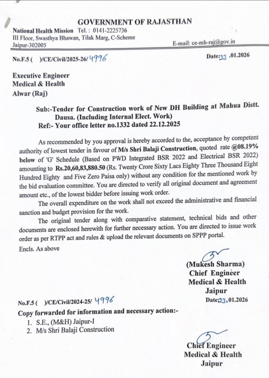 महुवा (अवधेश अवस्थी) महुवा विधायक राजेंद्र मीना एवं कृषि मंत्री डॉक्टर किरोडी लाल मीणा के सतत प्रयासों के परिणाम स्वरूप महुवा में राजकीय जिला अस्पताल महुवा के नए भवन लिए राज्य सरकार द्वारा लगभग ₹20 करोड़ रुपए की वित्तीय स्वीकृति प्रदान की गई है, जिसके पश्चात एनआरएचएम विभाग द्वारा आज मंगलवार को वर्क ऑर्डर भी जारी कर दिया गया है।
