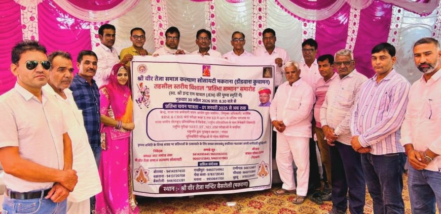 मकराना (मोहम्मद शहजाद)। श्री वीर तेजा समाज कल्याण सोसायटी, मकराना के तत्वावधान में आगामी 30 अप्रैल 2026 (गुरुवार) को जाट समाज का चतुर्थ तहसील स्तरीय प्रतिभा सम्मान समारोह बड़े हर्षोल्लास के साथ आयोजित किया जाएगा। यह भव्य समारोह सोसायटी के संस्थापक शिल्पकार स्वर्गीय इन्द्रराम बाबल की पावन स्मृति में श्री वीर तेजा मन्दिर, बैसरोली के प्रांगण में संपन्न होगा।